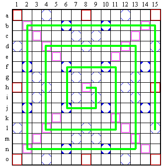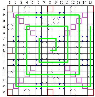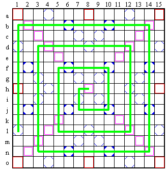 Evidemment, le trajet parcouru ne pourra pas �tre interrompu par des cases vides, car cela contreviendrait aux r�gles g�n�rales de placement des mots au scrabble. Aucune lettre ne pourra �tre plac�e en dehors des 102 cases marqu�es en vert.