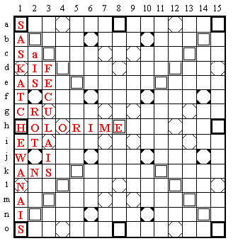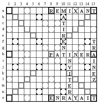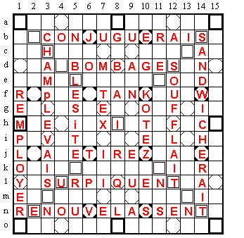 1. h7 XI 22 2. 7g EX 12 3. f7 TA 14 4. f7 TAN 3 5. 10f KOT 65 6. 10f KOTE 13 7. j8 REZ 75 8. j7 IREZ 13 9. j6 TIREZ 16 10. 5d BLESiTE 81 11. d5 BOMBAGES 84 12. 12d SOUFFLAI 68 13. l6 PIQUENT 128 14. l3 SURPIQUENT 38 15. 3j AIS 3 16. 3i VAIS 11 17. 3b CHAMpLEVAIS 90 18. b3 CONJUGUE 86 19. b3 CONJUGUER 19 20. b3 CONJUGUERA 20 21. b3 CONJUGUERAI 21 22. b3 CONJUGUERAIS 44 23. 14b SANDWICH 93 24. 14b SANDWICHE 26 25. 14b SANDWICHER 25 26. 14b SANDWICHERA 26 27. 14b SANDWICHERAI 27 28. n8 LASSENT 124 29. n1 RENOUVELASSENT 100 30. 1g EMPLOYER 140 31. 1f REMPLOYER 21 -------------------------- Total: 1508 p!!! |