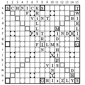 1. h7 FI 10 10 2. h7 FIL 6 16 3. h7 FILM 8 24 4. 11e MIDSHIP 115 139 5. f11 IN 2 141 6. f11 INDRI 8 149 7. 15a TWIRLING 221 370 8. L9 VIS 21 391 9. 10L IN 2 393 10. 10L INTI 6 399 11. o8 GRIzZLYS 374 773 12. 14m DRY 26 799 13. 8g RI 2 801 14. 8f TRI 3 804 15. 8f TRIN 4 808 16. f6 PST 11 819 17. 7a KRiLLS 14 833 18. a1 SCHNICKS 275 1108 19. c7 iN 1 1109 20. c6 ViN 5 1114 21. c6 ViNT 7 1121 22. c14 BI 4 1125 23. j10 XI 31 1156 24. 5a IF 5 1161 |