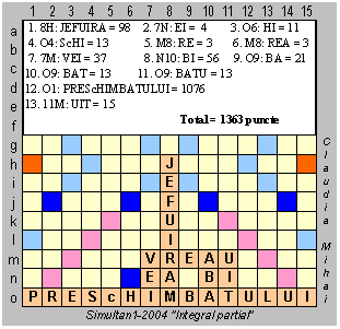 În concurs s-au obținut 1363 p. Încercați să obțineți punctajul ideal. Trimiteți soluțiile pînă la 1 Martie 2004, la adresa [email protected] (fără grilă - doar succesiunea depunerilor, precizînd pentru fiecare: poziția, CUVÎNTUL, punctajul). Succes!