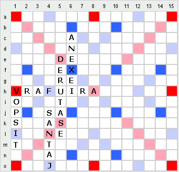 Cel mai mare punctaj însă îl obținem plasând SANTAJ în 4j, 58 de puncte, formând cuvintele adiacente SA, AS și NE cu ultimele litere ale cuvântului DERUTASE. Dacă în partida liberă ar fi fost recomandată depunerea SANTAJA la 3b, pentru a nu lasa adversarul să profite de deschiderea spaţiului de triplare de pe linia o, la duplicat sunt preferate solu&țiile care deschid grila, oferind cât mai multe posibilități de continuare. Soluția reținută pentru continuarea partidei (impusă prin regulament, fiind unicul top): SANTAJ în 4j, 58p. Rămâne D și se extrag alte șase litere: