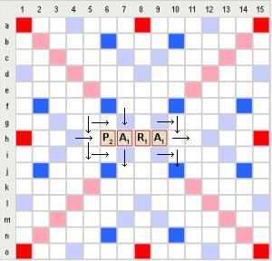 La jocul de scrabble, primul cuvînt trebuie să treacă prin centrul grilei, adică una (oricare) din literele acestui cuvînt trebuie sa fie plasată în căsuța centrală, h8.
