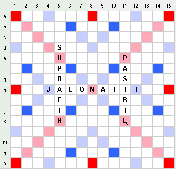I1. Aceasta putea fi depusă în L5, pentru a prelungi SUPRAFIN în SUPRAFINI (= 17 puncte), în L11 pentru a forma PASIBILI (16 puncte), sau în h12 pentru JALONATII (19 puncte). Am ales, evident, ultima soluție.