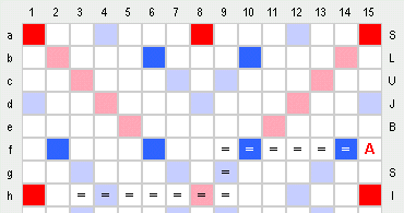 - Schema pe care o încercăm este prezentată în figura alăturată. Am notat fiecare literă pe care va urma s-o plasăm prin semnul = și am plasat, provizoriu, literele S, L, U, J, B, S, I în afara grilei, paralel cu linia 15a-15h pe care va fi depus nouarul.