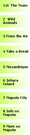 1st The Team | 2 Wild Animals | 3 From the Air | 4 Take a Break | 5 Mozambique | 6 Inhaca Island | 7 Maputo City | 8 Info on Maputo | 9 More Info |