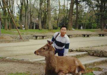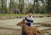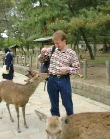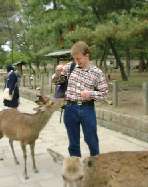 Seeing as we were short of time, we quickly left and crossed Nara Park to Todaiji Temple. Our route to the temple crossed through the Deer Park, and there were hundreds all around. Matt told me that English deer were far shyer than their Japanese counterparts. Lots of people were having fun taking photos with the deer. Some of the cheekier deer amused themselves by harassing schoolgirls!
