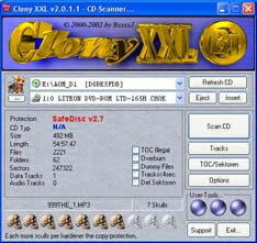 Ejecutamos el escaner del clony y le damos en "scan cd" apareciendonos en pantalla la protección con la que cuenta el cd. Le damos luego a exit cerrandonos el escaner :