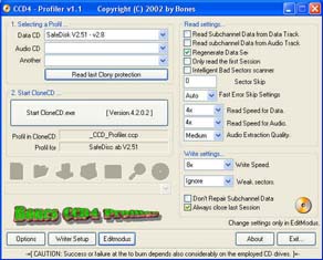 Bien, pues vamos a entrar en materia de una vez. El compañero indispensable del clonecd es el clony, programa que nos informa de que protección tiene nuestro cd original así como de darnos las opciones de configuración del clonecd para saltar dicha protección (esta parte es ahora independiente al clony) a la hora de hacer nuestra copìa de seguridad. La última versión del clony(v2.0.1.5) a bajar de http://bxxxxj.smokers-board.de/ , incorpora el escaneador de protecciones pero el perfilador viene aparte. El "perfilador" cuya última versión es la 1.2, viene en inglés y en bajenstrugen(aleman) al igual que el clony.