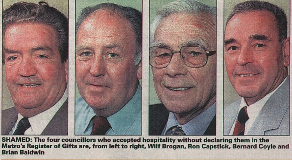 The four men involved, three commitee chairmen and a former leader, Councillors Ron Capstick, Wilf Brogan, Brian Baldwin and Bernard Coyle received undeclared hospitality.
