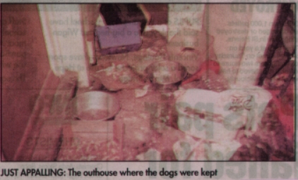 and water. One of the rabbit's eyes was missing and there were flies flying around the cage. The hutches were full of mouldy faeces."The two dogs were kept in a rotting outhouse, again full of mouldy
