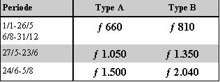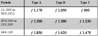 Prijzen per week per accommodatie in Nederlandse guldens. Combinatie met alle bestaande veerbootverbindingen mogelijk.