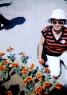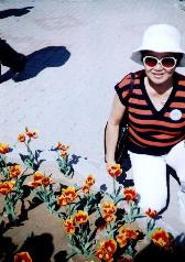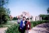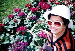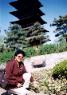 Japanese garden behind, mom's pointing at the cute little flowers on the ground.