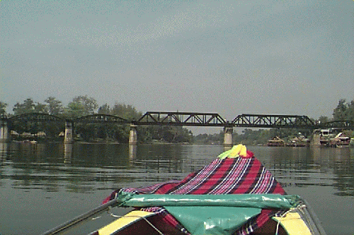 I'd have been happy to cruise upriver for hours, but eventually, we turned and literally flew back to the bridge. It seemed we danced across the waves, barely touching the water. Teens on the barges--I counted at least a dozen--waved as we rocketed by. The helmsman, a tourist pro, slowed to a drift near the River Khwae bridge and motioned me to take one more photo, and then we docked.