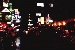 two or three clubs beckon. Young men lean against the walls in the shadows.