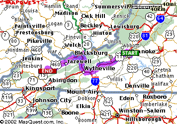 DIRECTIONS DISTANCE 1: Start out going North on US-221/US-220 BR/VA-116 towards US-11 N. 0.09 miles 2: US-221/US-220 BR/VA-116 becomes US-221/US-220 BR/US-11 N. 0.51 miles 3: Take the I-581 N/US-220 N ramp towards LEXINGTON/SALEM. 0.13 miles 4: Merge onto I-581 N. 5.66 miles 5: Take the I-81 S exit on the left towards BRISTOL. 0.36 miles 6: Merge onto I-81 S. 70.44 miles 7: Take the I-77 N exit- exit number 72- towards BLUEFIELD/CHARLESTON W.VA.. 0.27 miles 8: Merge onto I-77 N (Portions toll). 26.91 miles 9: Take the US-52 N exit- exit number 1- towards BLUFIELD. 0.21 miles 10: Turn SHARP RIGHT onto US-52 N. 0.22 miles 11: Stay straight to go onto US-52 N. 4.01 miles 12: US-52 N becomes US-460 W. 7.76 miles 13: Take the US-19 N ramp. 0.05 miles 14: Merge onto US-19 N. 0.16 miles 15: Turn LEFT onto VA-640. 0.01 miles 16: Turn LEFT onto US-19 S. 41.04 miles 17: Turn SLIGHT RIGHT onto VA-80. 5.64 miles 18: Stay straight to go onto DEPOT ST. 0.01 miles Total Estimated Time: Total Distance: 3 hours, 21 minutes 163.46 miles Take the first right onto 637 past the Honaker Funeral Home. Cross the Rail Road tracks and look for the signs on the right.