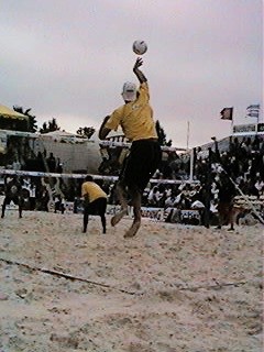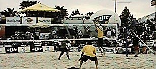 Saturday's exhibition match pitted locals Dave Counts and Said Souikani, both of San Diego against the WCOV's Ricky Nielsen from Dallas and Titus Humphrey from St. Croix in a ten-minute timed game. The locals fell behind 1-4 at the first break. After the side switch, a sideout and three ace serves by Dave Counts brought it to 4-4. Both teams put on a great exhibition with jump serves all around and high-flying blocks by WCOV's Ricky Nielsen and Dave Counts. |