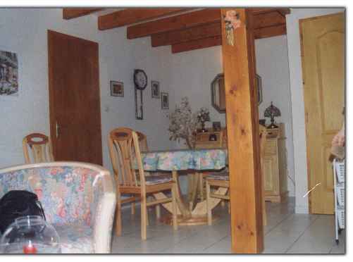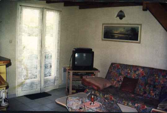 Sie befinden sich hier im Wohnzimmerbereich. Vor Ihnen die Fernseh-Sat Anlage sowie eine Doppelliege(Clic-Clac). Das Wohnzimmer ist sehr geräumig, mit Kacheln ausgelegt und teilweise mit Holzbalkendecke (vgl. Bild unten).