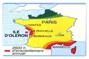 : Die 30 km lange und an der breitesten Stelle 10 km breite Insel ist 175 km2 groß, womit sie nach Korsika die zweitgrößte französische Insel ist. Vom Festland trennt sie der ,,Coureau" genannte Meeresarm und die Meerenge von Maumusson; aber seit 1966 ist sie über eine mehr als 3 km lange Brücke zugänglich, von der aus der Blick über Küsten und ehemalige Verteidigungsbauten (Fort du Chapus, Le Chateau) schweift, über Saint-Trojan und den Wald, und über austernbeladene Boote, die mit steigender Flut zu ihren Austernfischerhütten an der Küste zurückkehren. An den ca.40 km langen Sandstränden können Sie neben sportlichen Aktivitäten ( surfen, schwimmen, Strandsegeln etc.) auch einmal sie "Seele baumeln lassen" und das besonders in der Vor- und Nachsaison, wenn Sie im Mai, Juni, September und Oktober die Insel fast für sich haben. Die Sonnenscheindauer beträgt übrigens 2600 Stunden und übertrifft bei weitem die meisten französischen Landstriche (außer der Cote Azur).Das Meer