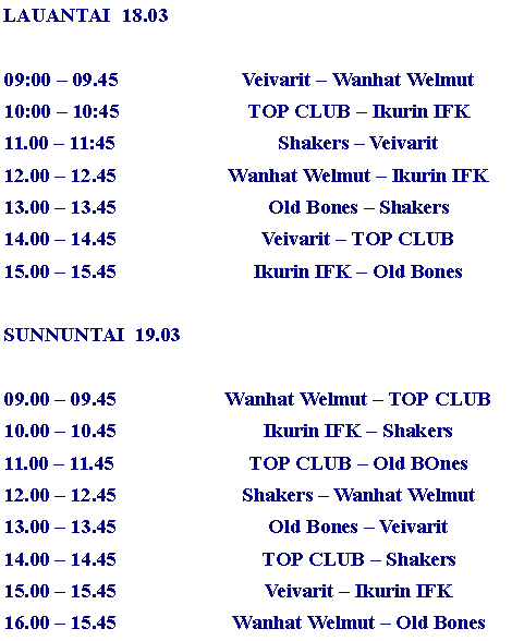 Otteluaika on 2 x 20 min. suoraa aikaa, ottelun kokonaisaika kuitenkin enintään 45 minuuttia.Loppusijoituksen tasapisteissä ratkaisee tehdyt maalit, päästetyt maalit, keskinäinen ottelu javiimeiseksi arpa.