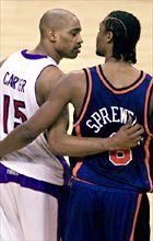 Picture: Toronto Raptors Vince Carter congratulates New York Knicks Leterall Sprewell as New York won game 3 (in the first round). New York will met their long time rival Miami Heat in the semi-fianls of the Eastern Conference.New York won the series 4-3. New York will meet Indiana Pacers in the conference finals.