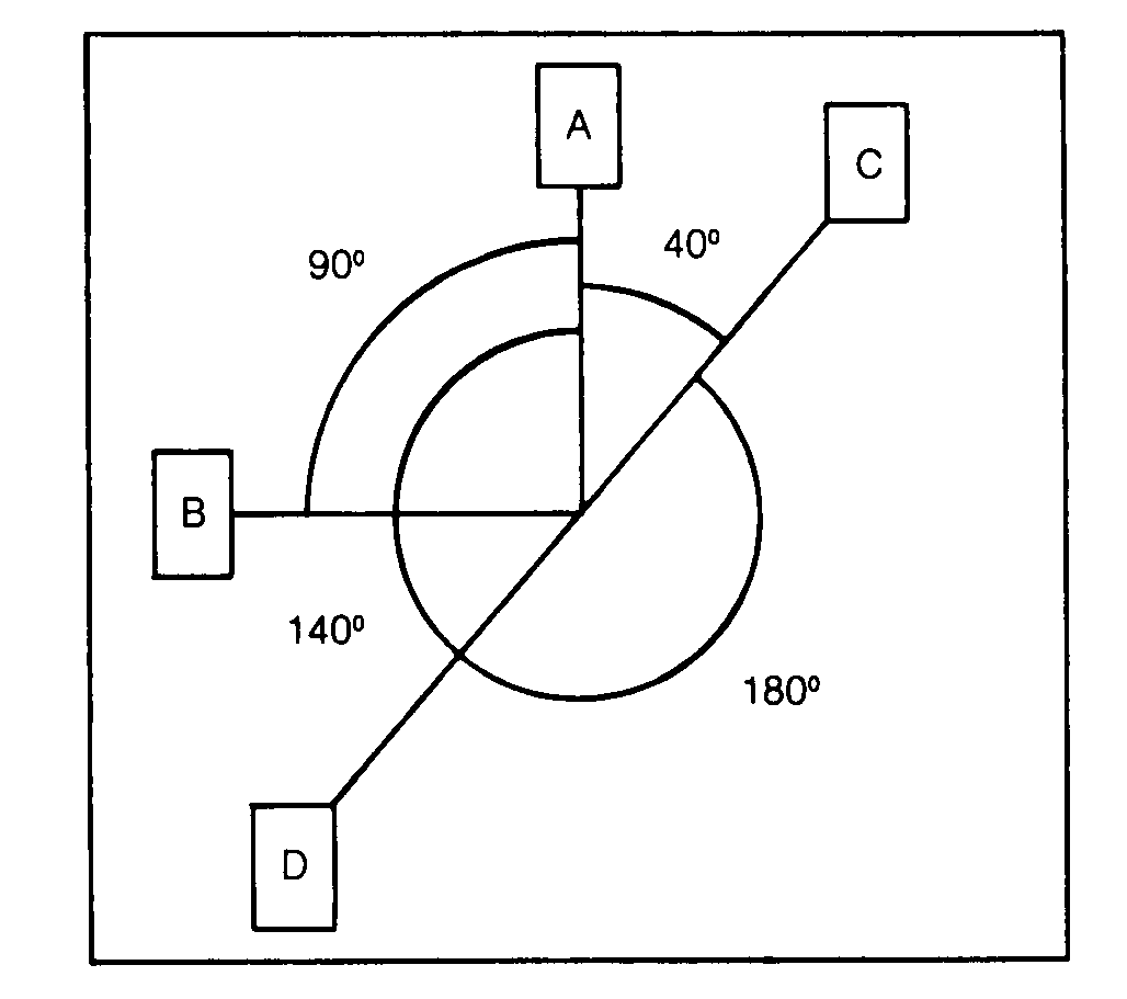 When using angular aspects in castings, the runester must measure (at least approximately) the angle at which any two lots in question are juxtaposed. This is done by mentally drawing lines from the two lots through the center point of the cloth, and then determining the angel at which they are juxtaposed. And example of this can be found in the following figure: