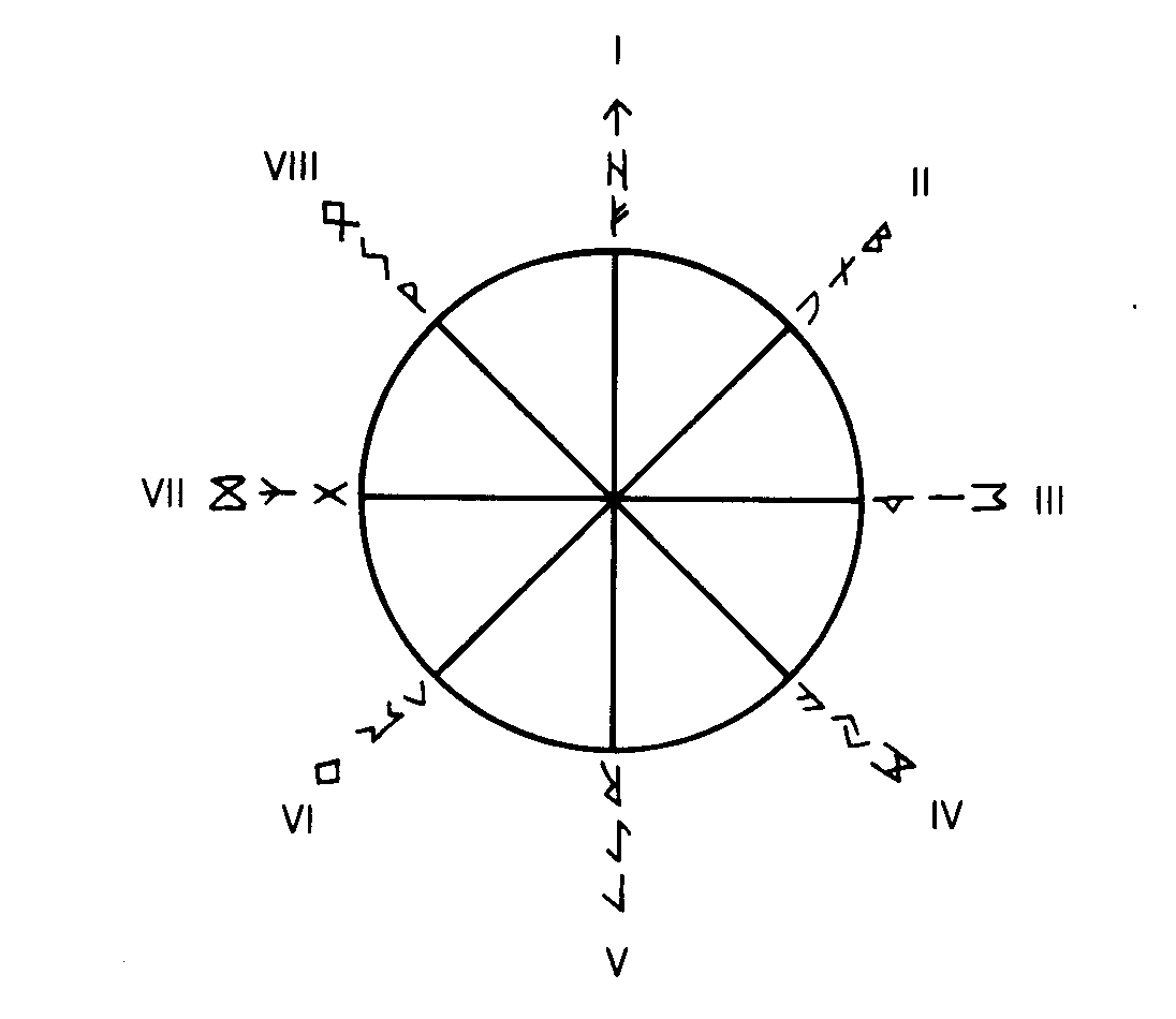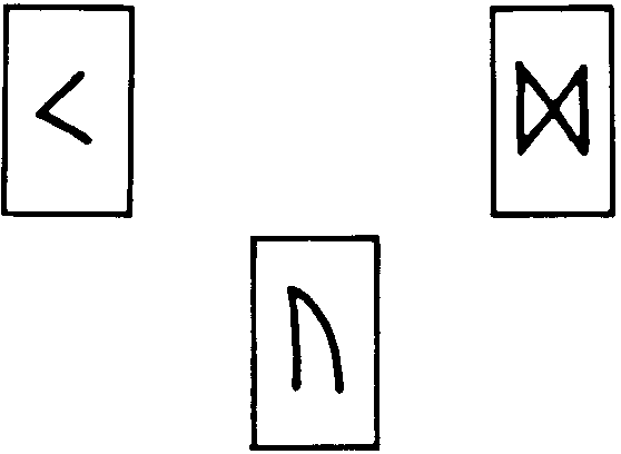 Aspects are determined in essentially two ways: (1) by the position a runelot falls in a casting (in other words, face up or face down; inside or outside a certain field), and (2) by the angle at which one runelot is juxtuposed to another. This latter method deserves a few introductory remarks. It will be noted that for the most part the rnestaves are constructed with acute or obtuse angle combinations, and that there are very few right angles in the shapes. Obtuse angles are known to have a dynamizing effect on the mind, while right angles generally have the opposite effect. (This was a matter of occult study in the late nineteenth and early twentieth century German magical order, and is upheld by at least one working Order in America today.) In any event, it is clear that in the tunic tradition obtuse or acute angles promote active, positive interaction between and among runes. Right angles create static; negative interaction or they can block the flow of runic force altogether. They actually cross it.