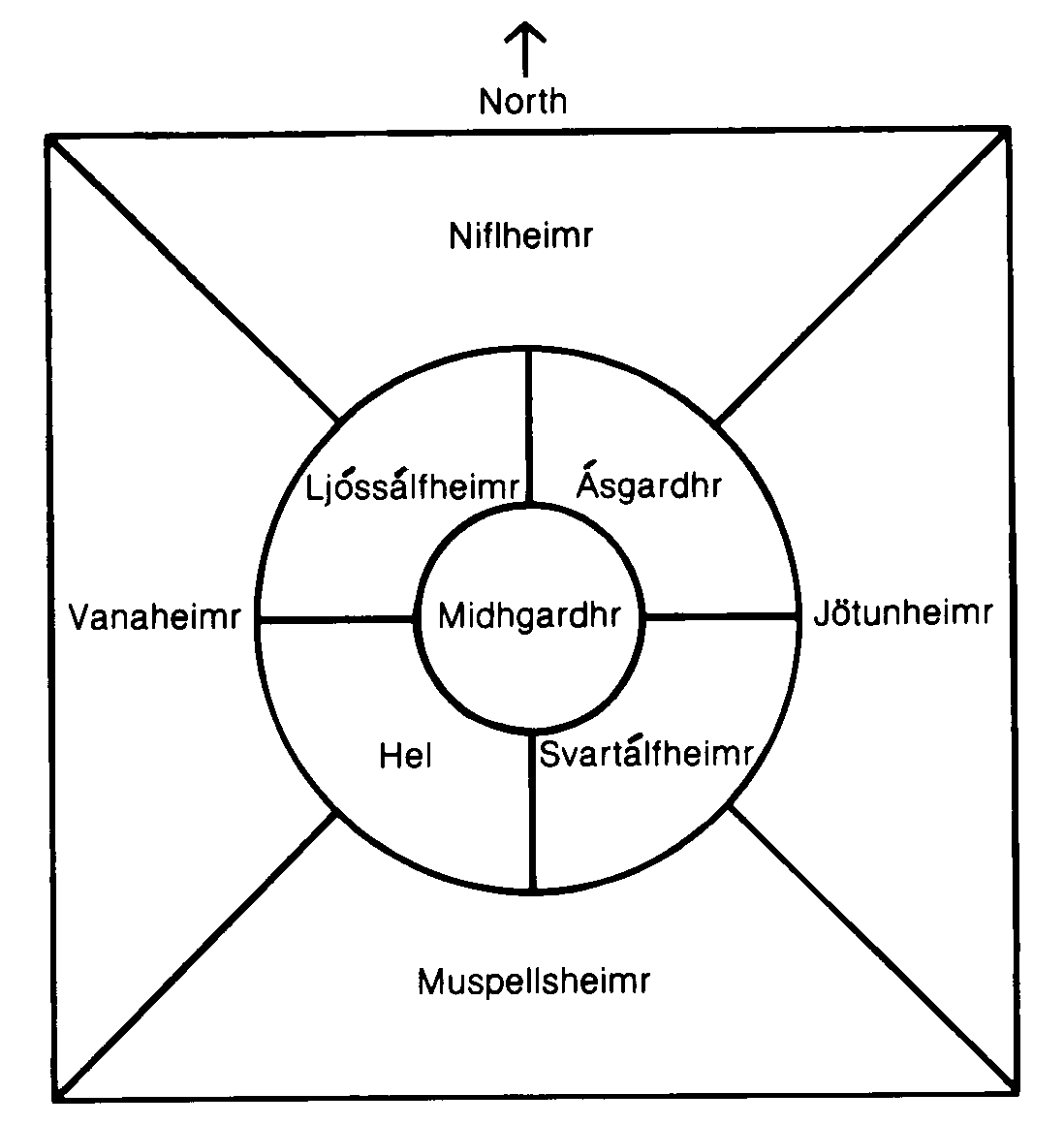 In reality, this figure represents the 'collapsing" of multidimensional space into a two- dimensional model-as do many sacred symbols of all kinds. The fields are names for the nine worlds of Yggdrasill and derive their meanings from these concepts as shown in the "Interpretations Table" on the next page.