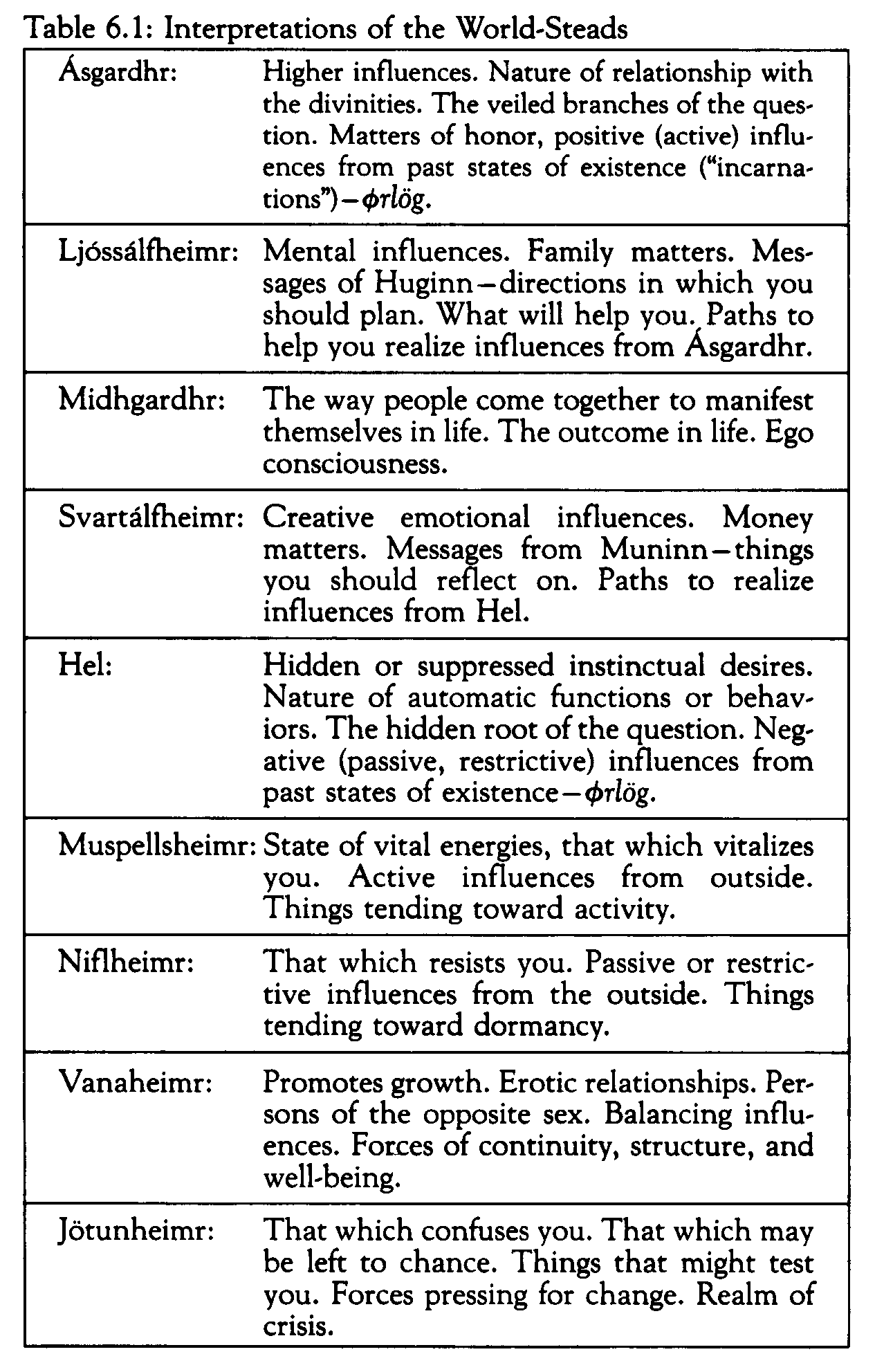 Those lots falling within the inner circles made up of Midhgardhr - Asgardhr - Hel - Ljossalfheimr - SvartAlfheimr (which in the three-dimensional model make up the vertical column) give a reading of the subjective or psychological state of, or influences on, the person. Those of Ljossalfheimr and Svartalfheimr are more "personal," while those of Asgardhr and Hel are more 'transpersonal." The lots coming down in the outer fields of Niflheimr-Muspellsheimr-Vanaheimr-jotunheimr (which together with Midhgardhr form the horizontal plane in the Yggdrasill model) clarify the state of the objective universe and how it affects the person in question. Note carefully the special synthesizing function of Midhgardhr-the center-where all potentialities are (or can be) manifested.