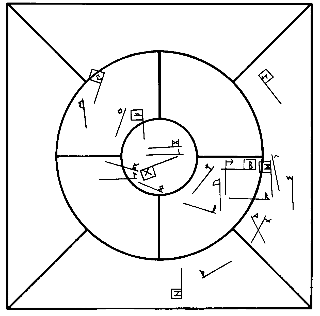 The runecaster may wish to decorate the cloth with the configuration of lines shown in the above illustration. Or, you simply may visualize these fields if you are able. Such hidden keys are usually the basis of forms of divination that might seem random at first glance. If the cloth is decorated, it should be embroidered with dark blue or black thread. Following ritual procedures outlined in chapter 5, the runester blindly casts the lots upon the cloth and then reads them (perhaps sitting on the theal's stool) as they lie on the cloth in their steads of meaning. According to personal custom, lots which land face down may be read as murk-staves or they may be removed from the cloth and set aside. 'Inverted" runes can- not be read as such in operations of this kind. Those that fall off the cloth altogether should be disregarded. (Note, however, what these lots are-they may be significant by their absence!)