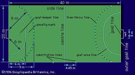 pontilhada a nove metros do gol que cruza a quadra de lado a lado
