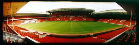 Ground Comment: Anfield has rapidly risen to one of the finest stadiums in the country without losing it's renowned character. The Kop which is now an all seater stand is world famous for it's humour and passion and the Liverpool fans have not let that diminish with the advent of all-seater stadia. Anfield now holds 45,362 with the massive Centenary Stand (formerly the Kemlyn Road) taking almost a third of the fans.