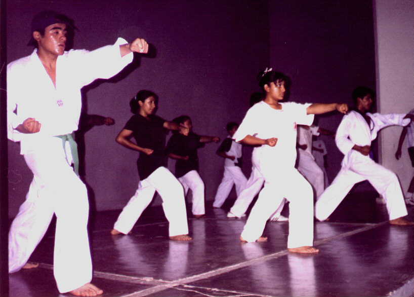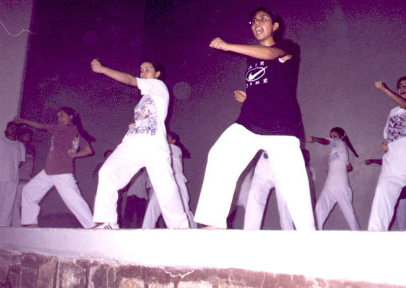 Aki vemos a parte del equipo de tkd entrenando mientras los de voli y fut entrenaban en el resto de la cancha.