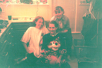This is a picture of Kate, | Jodi(the one with the tiger), and me. We used those pink tablets that turn your mouth red that you can get from the dentist. We were showing our red tongues. The picture didn't turn out very well though.