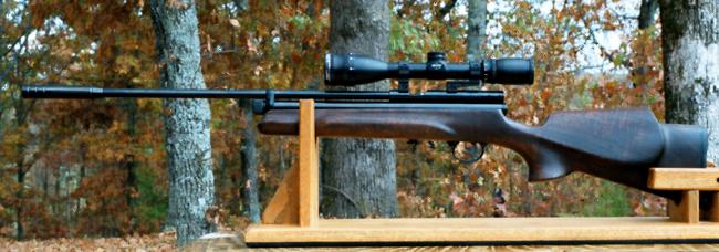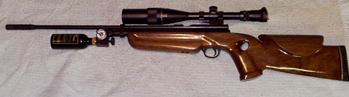 Here are a couple of pictures showing what can be done with a QB 78. The thumbhole stock was hand carved from a blank produced by Don Main, and it has 11 hand rubbed coats of Tru Oil finish with a Pachmeyer (sp?) butt pad. The scope is a Swift 6-18x44 AO from Marty at SS. The bulk adapter is a Mazibulk unit with a built-in pressure guage. The barrel band and muzzle break are made by CJ Pitts. The internals (valve body reshaping, piercing pin reshaping, valve return spring shortening, porting, polishing, bolt probe, additional barrel retaining setscrew, trigger return spring retaining bolt shortening, and sear honing work) have been tweaked and it shoots the following strings: