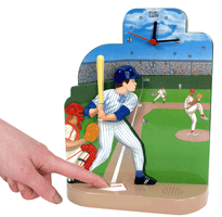- This clock features a batter at home plate continuously swinging his bat.