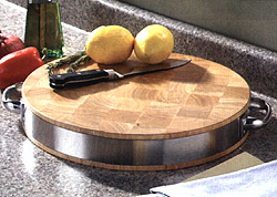 - A hefty 2 1/2" thick, this heavy duty chopping block is trimmed with an attractive 18/10 stainless steel band.