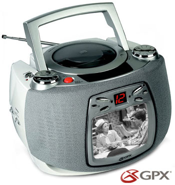 Features a 5-inch black-and-white TV and a top-loading CD player, plus AM and FM stereo radio.
