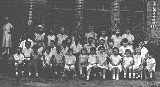This photo taken in 1932, shows a K-6 school for missionary children in Tsinan, Shantung Province, China. A broad spectrum of churches were represented. The mothers taught the school. Their husbands taught at Cheeloo Christian University. The lady at the far left was the principal. Our own Louise Cady Hall, age 8, is the fourth student from the left, back row.