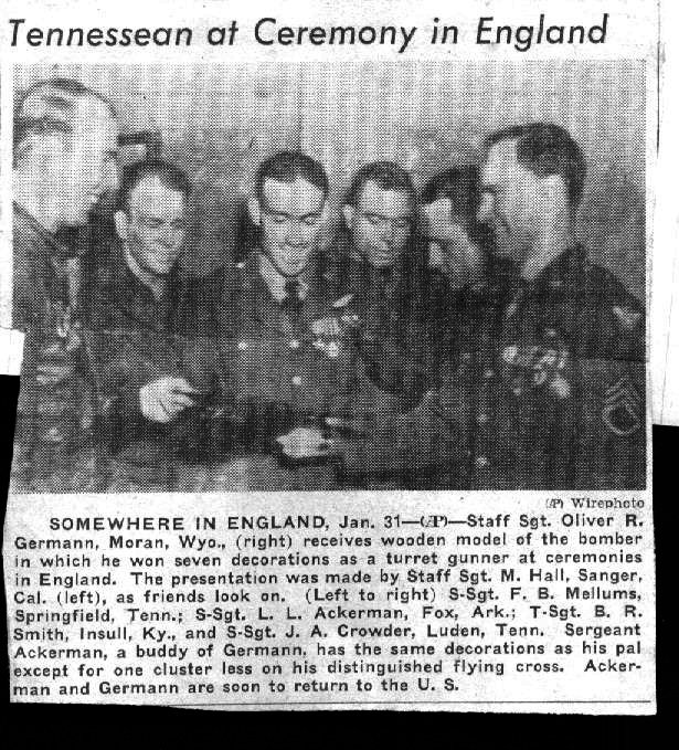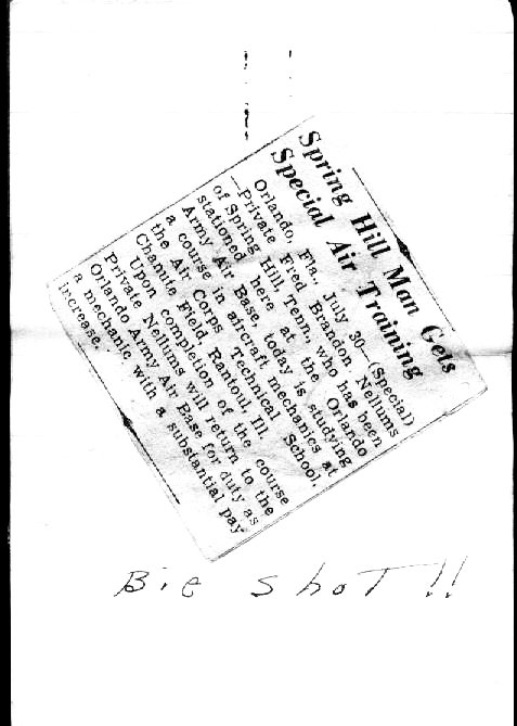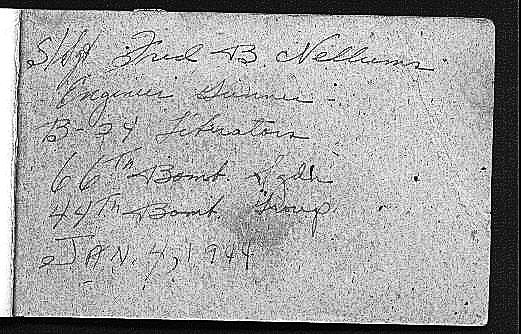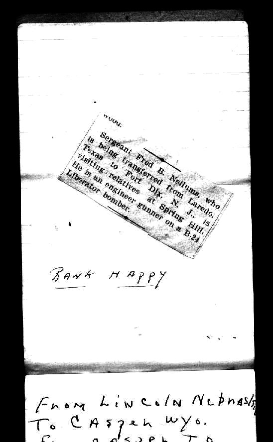 Places I've been stationed in Army.Joined Army April 16, 1941. Was sent to Orlando Fla. to the 13th Bomb Group July 1, 1941. Was sent to Air Machanic School at Chunute Field, Illinois. Dec. 1941 was sent from Chanute back to Orlando Fla. to the 39th B. Sqdn. Jan. 1942 left Orlando Fla and went Westover Mass. July 17, 1942 left Westover and went to Dover Del. Changed from 39th B to 3rd Anti-Sub. March 1943 left Dover and went to Ft. Dix, N.J. May 1943 left Ft. Dix and went to Gunnery School at Laredo Texas. June 1943 left Laredo and went back to Ft. Dix. July 1943 left Ft. Dix. and went to Langley Field Va. to the 18th Anti-Sub. July 1943 left Langley for Mitchel Field N.Y. July 1943 left Mitchel and flew to Presove Islemaine, then Gander Field, Newfoundland. Aug 1943 left Newfoundland for Scotland(Preswick). Aug 1943 left Scotland for Dunkeswell, England to 19th Anti-Sub 479th Group. Oct 1943 left Dunkeswell and went to Alconbury, England. Oct 1943 left Alconbury and went to Flickston, England. Oct 1943 left Flickston and went Shipdham to the 66th Bomb Sqdn, 44th Bomb Gp - 20 missions. April 18, 1944 transfered to 67th Bomb Sqdn. - 44th Bomb Gp. Left England for US. Iwent to Ft Meade Maryland. From Ft. Meade to Lincoln, Nebraska. (then) From Lincoln Nebraska to Casper Wyo. From Casper to Sioux City, Iowa. From Sioux City to Ft. McPherson, Ga. From Omiga to HOME.