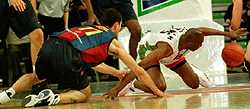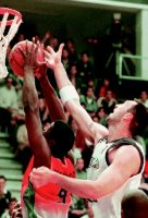 Chuck Kornegay gana un rebote ante Struelens