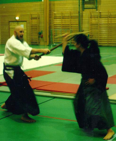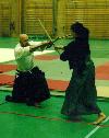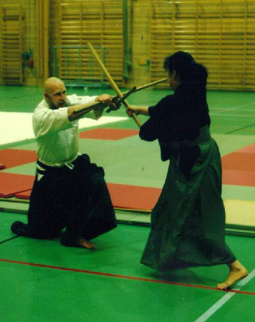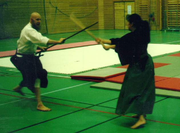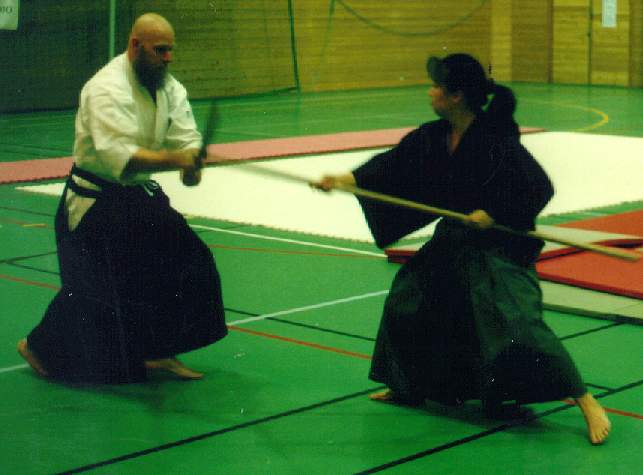 The following 7 pictures features senseis Eri Kusano and Are Larsen Kusano. Most of them from a demonstration of Tenshin Shoden Katori Shinto Ryu. Eri Kusano sensei is a 5th dan of Katori Shinto Ryu under shihan Yoshio Sugino, and has studied at his dojo for many years. She is also a master of the traditional Japanese tea ceremony. Are Larsen sensei is a 4th dan in Katori Shinto Ryu, and also studies at shihan Sugino's dojo. In addition he is ranked in a number of other martial arts; 5th dan jujutsu, 4th dan aikido, Kyudo and Iaido, and 2nd dan Shorinji Kempo and Arnis. He lives with his wife Eri and their son Motoyoki in Japan.