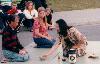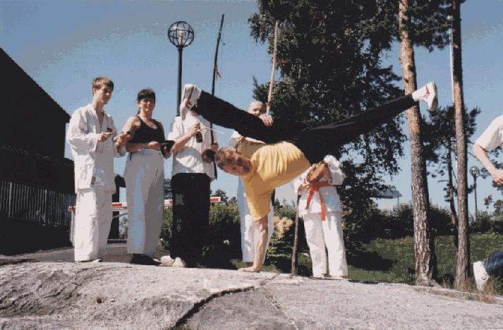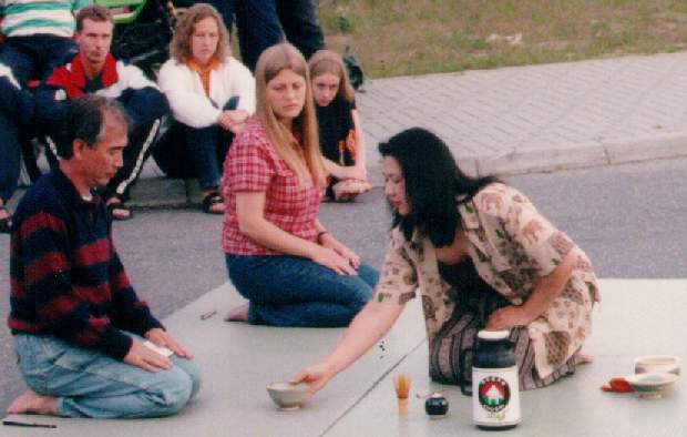 To the left below we see sensei Claes Bjurestig, 5th dan Ju jutsu, demonstrating a throw. He is also one of the "old-timers" in teaching at the summer camp, and is famous for his very direct and effective Ju jutsu. To the right of him, Haakon is doing a Katori Shinto Ryu kata, a Tae Kwon Do'ist is in an advanced form, and two jujutsuka doing newaza. In the second row we see sensei Eri Kusano serving tea to shihan Yamaue and a student, in a tea ceremony outdoors, after training one of the days at summer camp. The last picture is from the kids camp, where there has been a little ice cream expedition to the town centre!