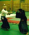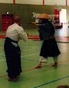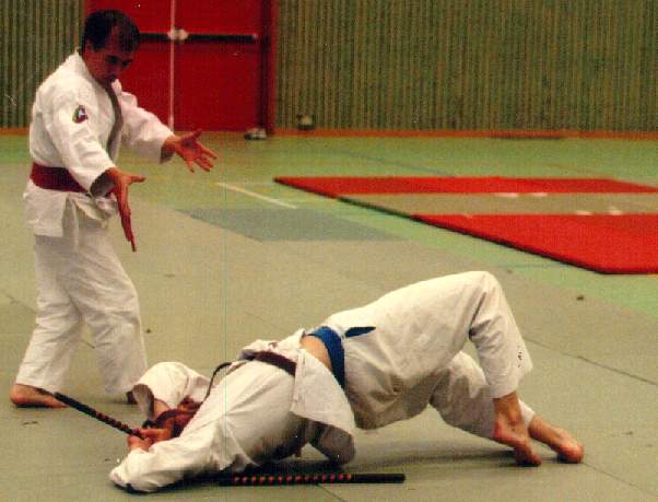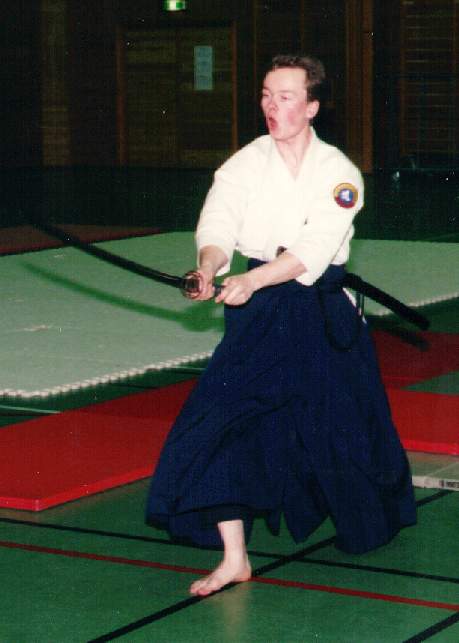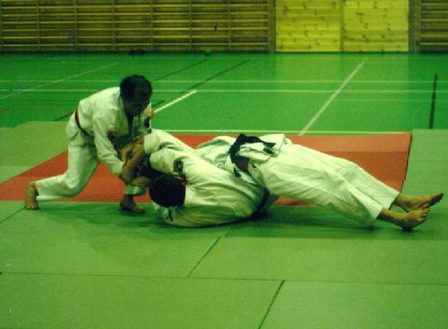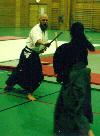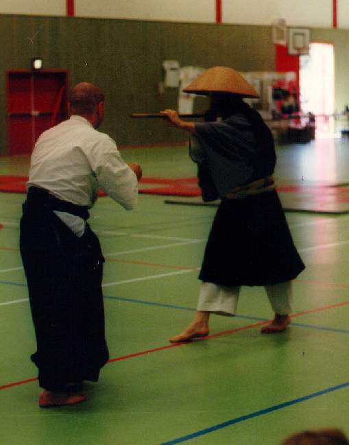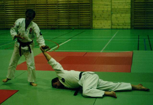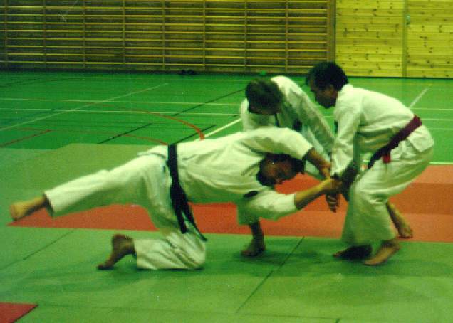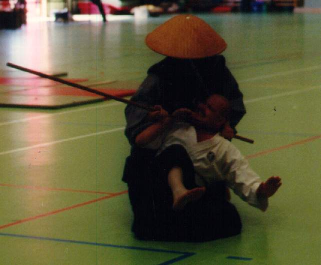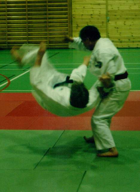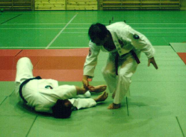 The first 18 pictures below, are of shihan Yamaue - soke of Yamaue Aikijutsu, and head of the Scandinavian Budo Organization. He has been the main attraction at the camps that NBO (the Norwegian Budo Organization) has organized for many years now. Most martial artists (as well as non MA-ists!) who see shihan Yamaue demonstrate techniques on others or them selves are totally amazed of what Yamaue does with their bodies. He always teach interesting and practical techniques, and his demonstrations of the use of Ki (inner energy) is really spectacular. It's difficult to judge by still photos, but if you look closely at some of the pictures below you will see that uke (person receiving the technique) is sometimes locked up in pain by only a very little touch by shihan Yamaue, and in one picture Yamaue has even let go of uke, who is still locked up, unable to move or get out of the lock...