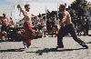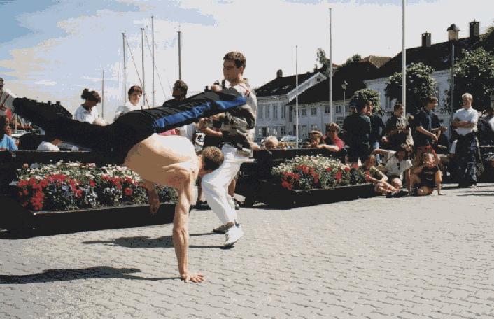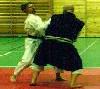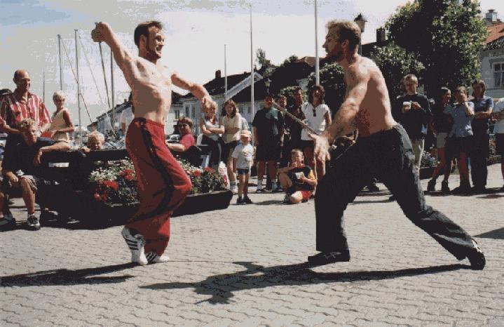 In the picture at the top left below, sensei Are Larsen demonstrates a Katori Shinto Ryu form with his son Motoyoki (who at the age of 5 already knows much about budo!) In the two pictures to the right Are Larsen is demonstrating Shorinji Kempo with Hans Petter Skolsegg. In the two pictures to the left in the 2nd row we see Are Larsen dressed as a "wandering monk" being attacked by a "villain".