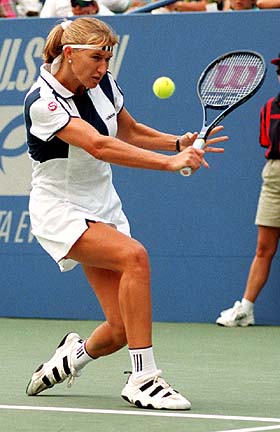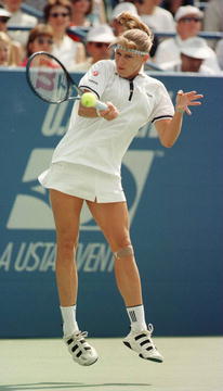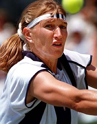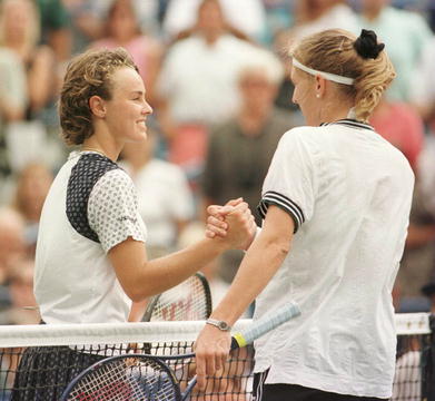 The semifinals produce yet another classic match of experience versus youth. This time though, Steffi's foe is Swiss kid, Martina Hingis, who has already taken out Sanchez-Vicario and Novotna in the tournament. After one game, which Hingis wins, the rains come down, and the match is postponed until Saturday. Hingis keeps her advantage and moves into a 5-3 lead. As if this isn't enough, Hingis holds five set points in all, only to see Steffi save them all. Steffi wins six consecutive games to race into a 2-0 lead in the 2nd set. Hingis then revives slightly, but she is no match for Steffi who closes the match with a trademark forehand passing shot winner for a 7-5, 6-3 victory.