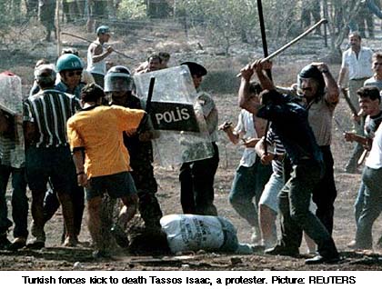 Among the unarmed demonstrators marching towards the north was Tassos Isaak. Little he know that he was never to see again the girl he has just married to, nor he would ever see his daughter, about to be born. Two more civilians followed Tasso Isaak to death, all murdered by the Turkish invasion force. One final note: The European parliament has demanded the arrest and prosecution of the murderers. The Turkish government still harbors them, and steadfastly denied complying. Until today, the murderers are free.
