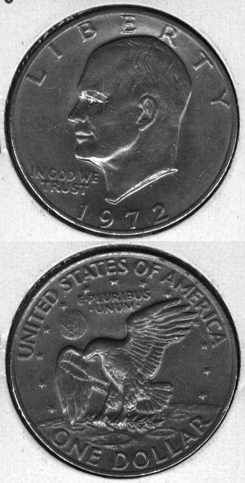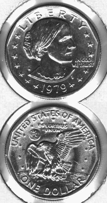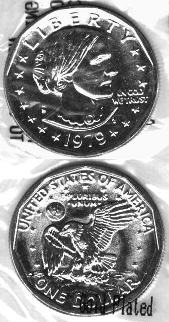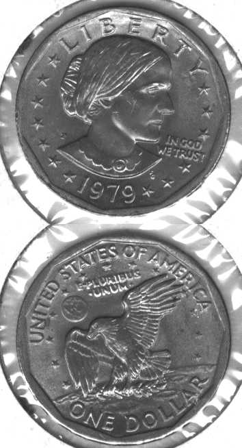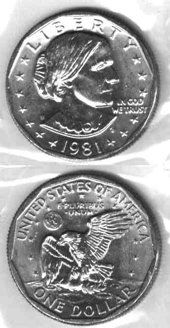 An interesting design element of the Peace Dollar is the use of the roman U in the word trust, which looks like the letter V, leading people to believe that the coin they have is an error example. The Eisenhower Dollar, Ike for short, was issued in 1971, honoring the popular W.W.II military leader and 34th president of the United States, Dwight Eisenhower, the last of the large one dollar coins, his portrait faces left on the obverse and the Apollo 11 Insignia of the 1969 space mission.., which put the first man on the moon, on the reverse. The Susan B. Anthony Dollar, issued in 1979, is the first coin to honor a women. Miss Anthony was a leader in the fight for women's voting rights. Her portrait faces right on the obverse and the famous Apollo 11 Insignia, the eagle landing on the moon on the reverse. The Mini-Dollar slightly larger then a quarter, wasn't readily accepted, mainly because it often became confused with the quarter and so no one wanted them. Vaults became stockpiled with 1979 and 1980 dollars, so in the middle of 1981 the U.S. Mint decided not to bother to issue the 1981 Anthony Dollars for circulation, and only a limited number were produced, making the 1981 Anthony Dollar the last and rarest year of the series. The new dollar coin released in 2000 is the same size as the SBA and has a gold color. Maybe this one will last for more then three years.