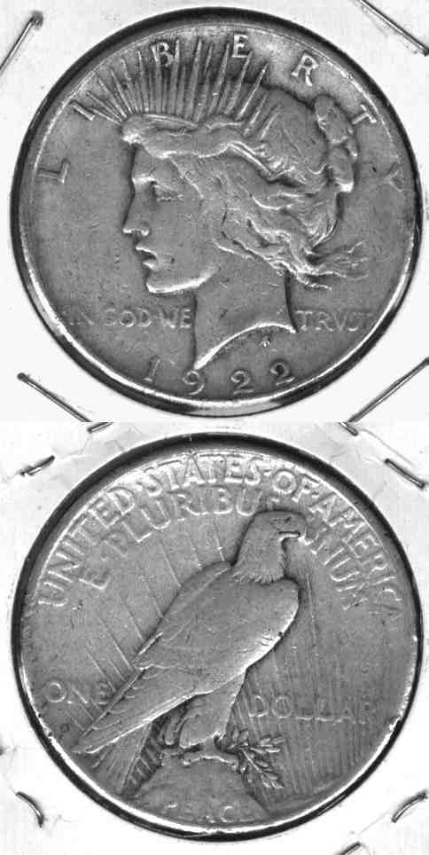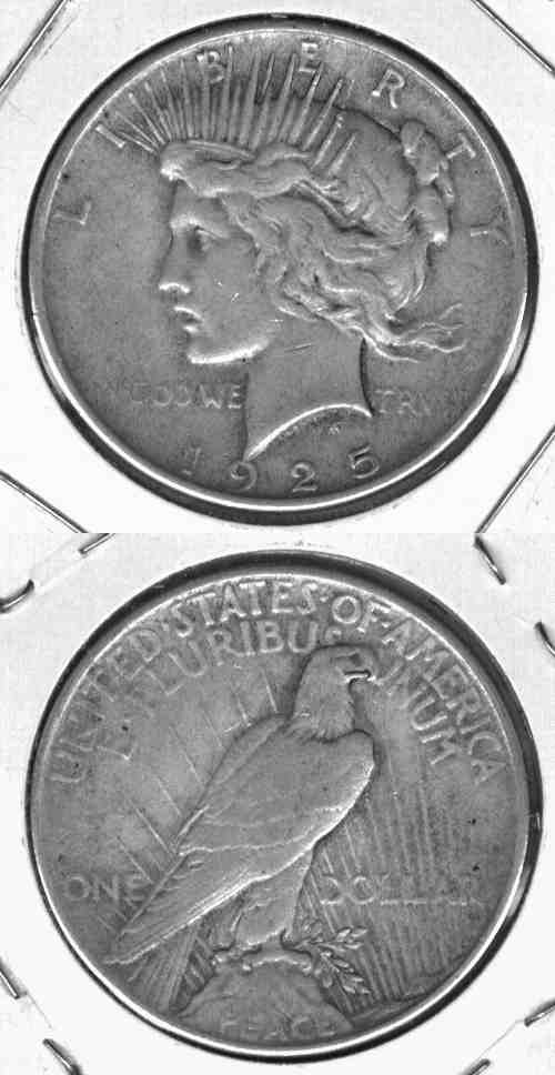 of the coin under the neck of Miss Liberty. The word PEACE is found under