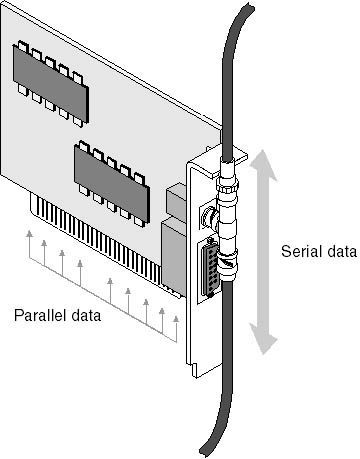 The NIC takes data that is traveling in parallel as a group and restructures it so that it will flow through the 1-bit-serial path of the network cable. Figure 2.25 shows a server converting parallel data to serial data on the network. This is accomplished through the translation of the computer's digital signals into electrical or optical signals that can travel on the network's cables. The component responsible for this is the transceiver (transmitter/receiver).