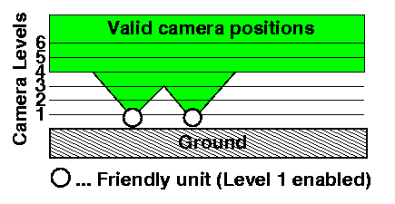 | Make the camera level depend on the closest friendly unit, i.e. in enemy territory just allow view level >= 4 whereas close to a friendly unit allow view levels down to 1 (see Figure). The former would correspond to the "map view" I suppose every commander had. The height level restriction would prevent that players check LOS by moving around at eye-level with the camera. |